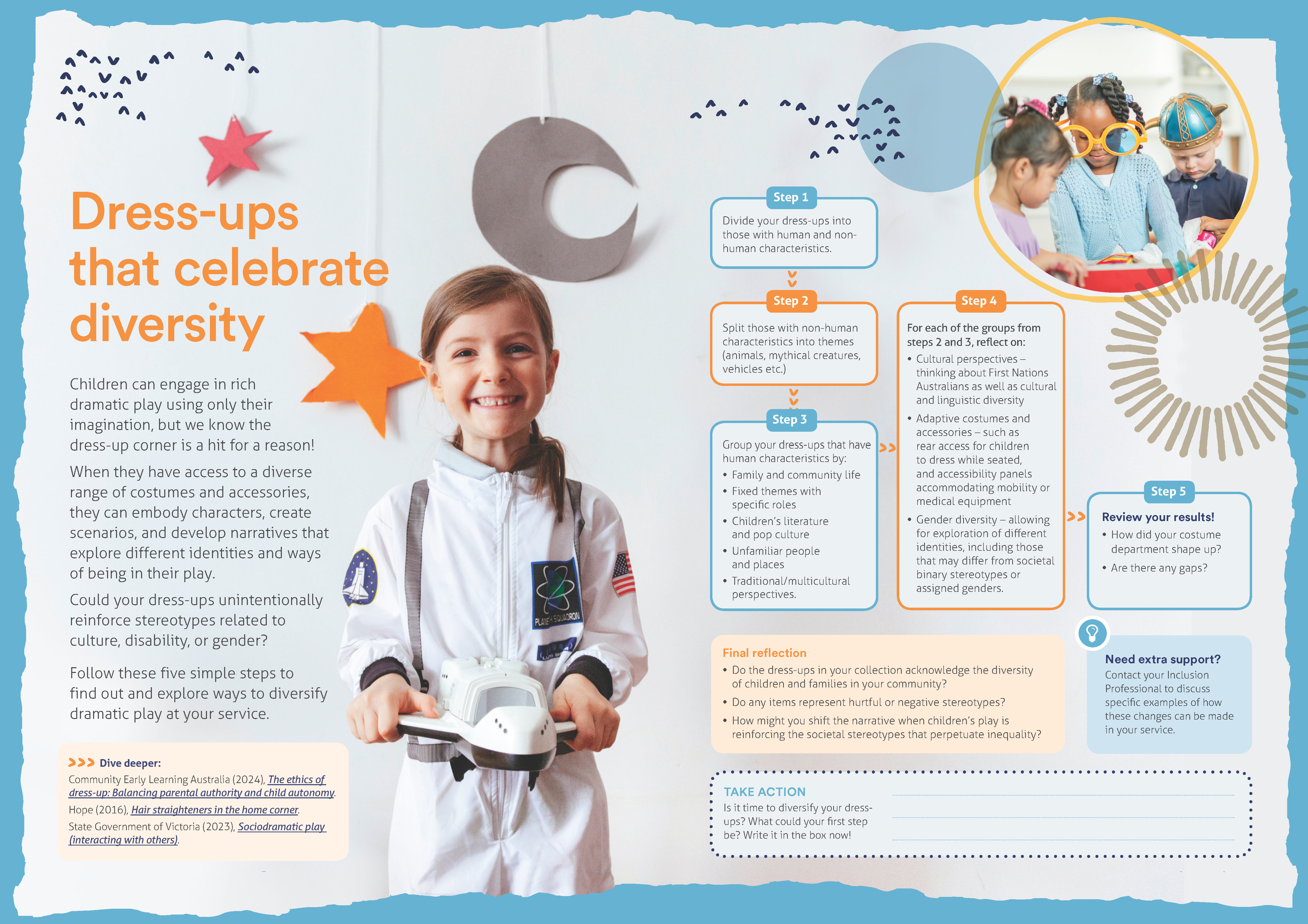 Children can engage in rich dramatic play using only their imagination, but we know the dress-up corner is a hit for a reason! When they have access to a diverse range of costumes and accessories, they can embody characters, create scenarios, and develop narratives that explore different identities and ways of being in their play. Could your dress-ups unintentionally reinforce stereotypes related to culture, disability, or gender?